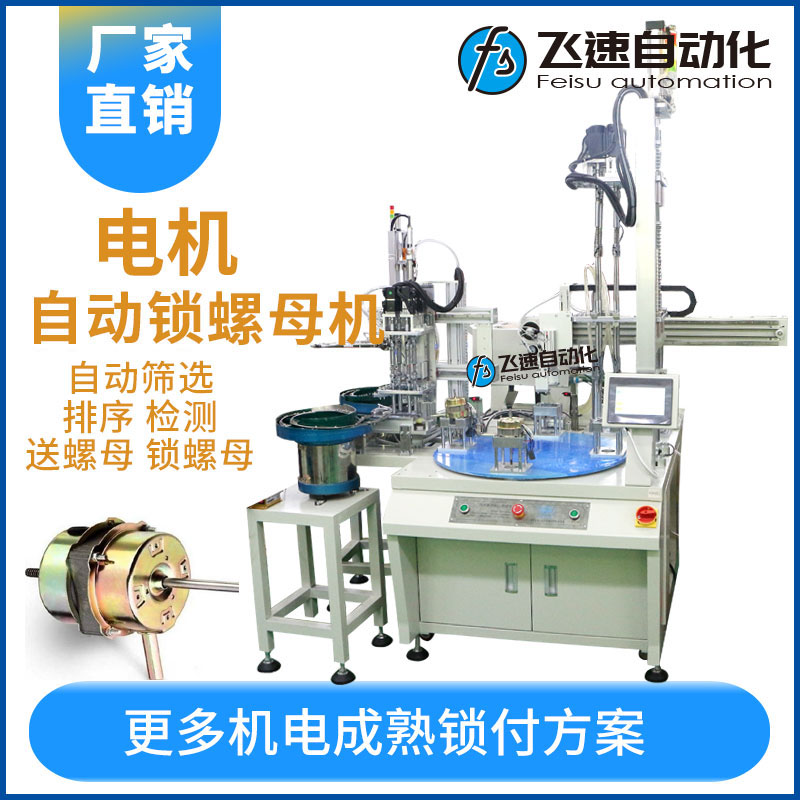 - 產品簡介: 風扇電機自動鎖螺母機自動送螺母、擰螺母、取產品均由設備自動完成。 電機風扇是一種具有風扇轂和葉片的電機,其作用是產生驅動轉矩的動力源,風扇電機主要由外殼、設于外殼內的轉子、固設于外殼內壁上且繞轉子設置的定子及端蓋組成。在組裝生產種需要用的五金標準件之一的螺絲進行安裝緊固,廠家生產一直都是傳統人工進行手工產品進行裝配一枚一枚螺絲擰緊或者采用一種電動螺絲刀來操作,在生產上不僅勞動強度大,生產效率低,而且在擰緊工件時無法控制力度,出現旋緊力不均或者容易滑牙等問題造成不良產品。 為此廠家會選購一臺自動化螺絲機來代替繁瑣的工作和提高工作效率 質量等,飛速自動化生產的轉臺式多軸自動鎖螺絲機,設備配置了一個轉臺多個工位操作,設備上配置了兩臺振動盤自動定向排序的送料設備,其工作目的是通過振動將螺絲自動有序定向排列整齊、準確地輸送到轉臺操作工位上然后由四軸把螺絲放置在配置好的工件上進行轉動扭緊螺絲釘,將擰好螺絲的產品由機械手自動送入出料倉,人工無需再去取產品,個過程都通過轉盤同時進行,各工位互不干擾,設備優勢在于減少人工作業量,工人放置產品即可,送螺母、擰螺母、取產品均由設備自動完成。