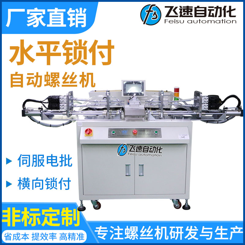 - 產品簡介: 本案例采用水平方向自動打螺絲機,鎖付系統水平放置,可一次同時擰好多個方向的螺絲。設備尺寸規格可根據產品形狀尺寸來設計。